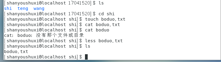 5.进入当前目录的第一个子目录,然后显示当前目录,并列出当前目录的内容,并向文件boduo.txt写入一个字符串konijiwa