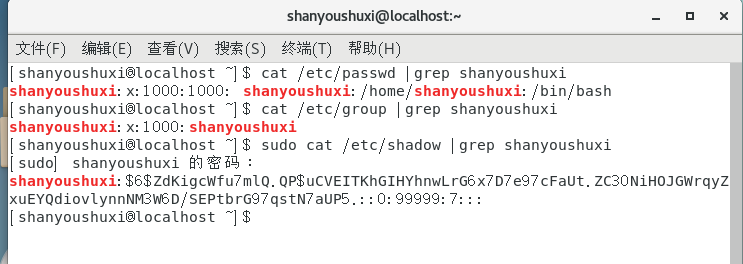 sudo cat /etc/shadow |grep xx #查看当前用户的口令配置文件(密码和登录信息,加密文件)