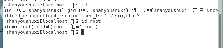 [shanyoushuxi@localhost ~]$ id root