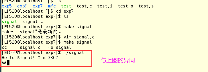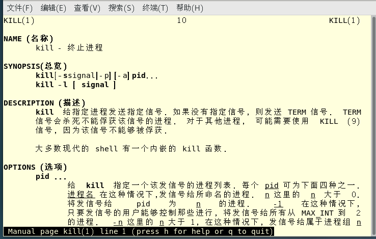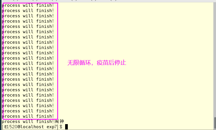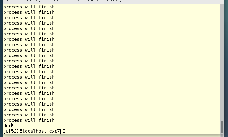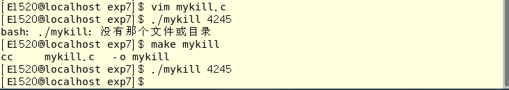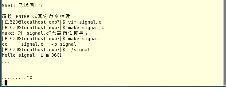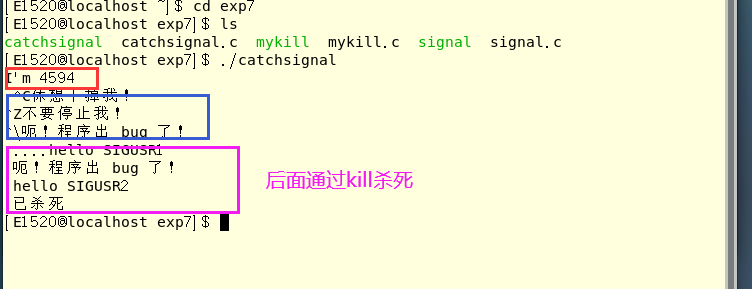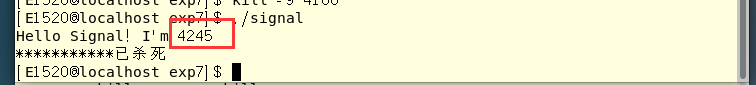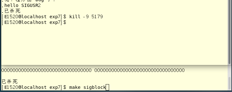 (2)在另外一个终端输入 kill 命令来向该进程发送信号,观察进程对接收到信号的反应。