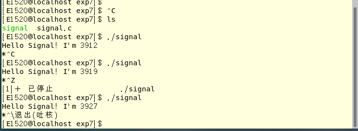 (1)给该进程发送ctrl+C、ctrl+Z、ctrl+\信号,观察进程对接收到信号的反应。