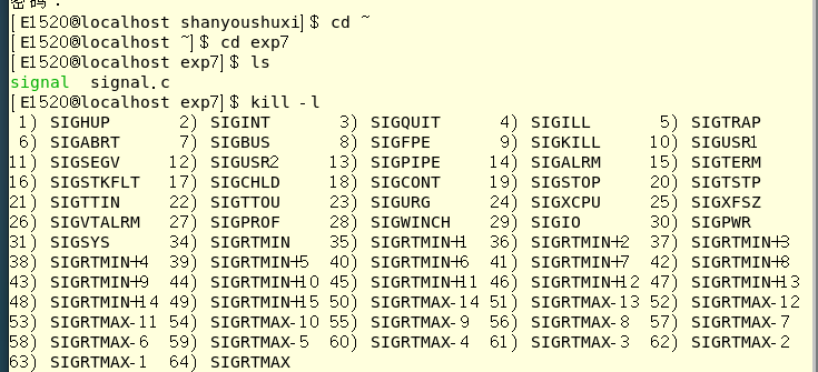 (2)另外再开启一个终端,在终端通过输入 kill 命令来给进程发送信号,进程的 pid 在程序运行的第一行输出。 在终端通过输入 kill -l 来查看当前系统当中的信号列表: