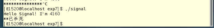 重新运行程序:在当前终端我们可以看到程序输出自己的 pid 是4160,这是我们可以另开一个终端,通过 kill 命令向该进程发送信号,这里发送了信号值为9的信号给了进程4160.再切换到运行程序的终端来观察进程接收到信号后的反应。