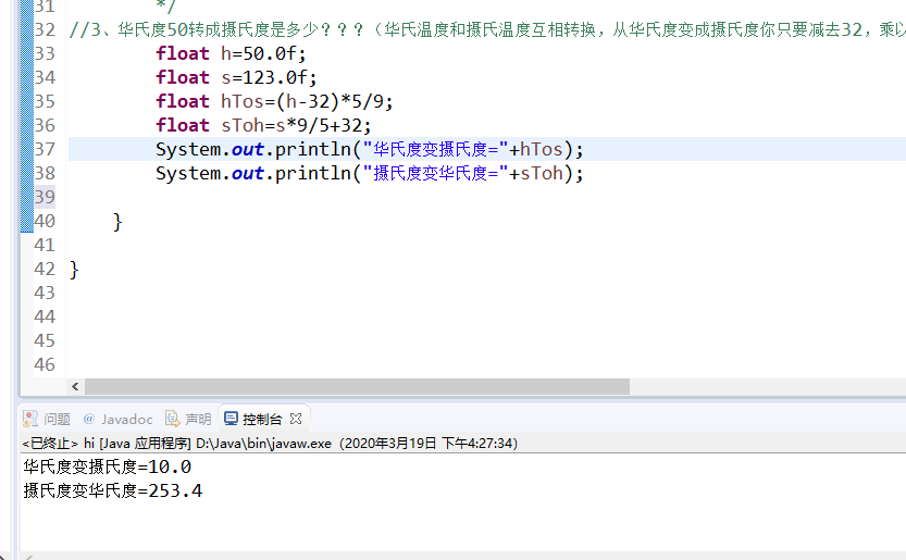 package hello;public class hi { public static void main(String[] args) { float h=50.0f; float s=123.0f; float hTos=(h-32)*5/9; float sToh=s*9/5+32; System.out.println("华氏度变摄氏度="+hTos); System.out.println("摄氏度变华氏度="+sToh); } }