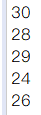 package text; import java.util.Random; public class Ran { public static void main(String[] args) { Random r=new Random(); int[] n=new int[5]; for(int i=0;i<n.length;i++) { n[i]=20+r.nextInt(11); System.out.println(n[i]); } } }