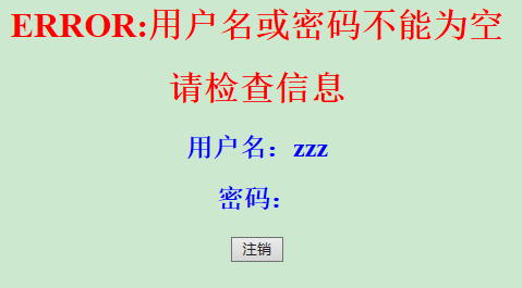 <%@ page contentType="text/html;charset=UTF-8" language="java" %> <html> <style> h1{ color: red; } h2{ color: blue; } </style> <head> <title>fail</title> <script type="text/javascript"> function zX(){ sessionStorage.removeItem("uname"); sessionStorage.removeItem("upwd"); window.location.href = "index.jsp"; } </script> </head> <body> <div align="center"> <h1>ERROR:<%=request.getSession().getAttribute("flag")%></h1> <h1>请检查信息</h1> <h2>用户名:<%=request.getSession().getAttribute("uname")%></h2> <h2>密码:<%=request.getSession().getAttribute("upwd")%></h2> <button type="button" name="button1" value="注销" onClick="zX()">注销</button> </div> </body> </html>