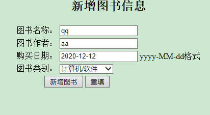 <%@page import="bean.Book"%> <%@page import="dao.BookDao"%> <%@ page language="java" import="java.util.*" pageEncoding="UTF-8"%> <% String path = request.getContextPath(); String basePath = request.getScheme() + "://" + request.getServerName() + ":" + request.getServerPort() + path + "/"; %> <!DOCTYPE HTML PUBLIC "-//W3C//DTD HTML 4.01 Transitional//EN"> <html> <head> <base href="<%=basePath%>"> <title>图书管理系统</title> <meta http-equiv="pragma" content="no-cache"> <meta http-equiv="cache-control" content="no-cache"> <meta http-equiv="expires" content="0"> <meta http-equiv="keywords" content="keyword1,keyword2,keyword3"> <meta http-equiv="description" content="This is my page"> <!-- <link rel="stylesheet" type="text/css" href="styles.css"> --> <script type="text/javascript"> window.onload = function() { doubleBgColor(document.getElementById("record_table","#e5f1f4","#f8fbfc")); } function doubleBgColor(Table,Bg1,Bg2) { for (var i=0;i<Table.rows.length;i++){ Table.rows[i].bgColor=i%2?Bg2:Bg1; } } </script> </head> <body> <% BookDao bd = new BookDao(); // String uname = (String) session.getAttribute("name"); List<Book> list = bd.getReceive(/* uname */); %> <div align="center"> <h1>图书信息</h1> <table border="3" id="record_table"> <tr> <td>图书名称</td> <td>图书作者</td> <td>购买时间</td> <td>图书分类</td> <td>操作</td> </tr> <%for(int i=0;i<list.size();i++){ %> <tr> <td><%=list.get(i).getName() %></td> <td><%=list.get(i).getAuthor() %></td> <td><%=list.get(i).getTime() %></td> <td><%int x=list.get(i).getType(); if(x==0){ %> <p>选择所属分类:<p> <% }if(x==1){ %> 计算机/软件 <%}if(x==2){ %> 小说/文摘 <%}if(x==3){ %> 杂项 <%} %> </td> <td><a href="DelServlet?id=<%=list.get(i).getId()%>">删除</a></td> </tr> <%} %> <!-- <tr><td><a href="add.jsp">新增图书信息</a></td></tr> --> </table> <a href="add.jsp">新增图书信息</a> </div> </body> <script type="text/javascript"> $(document).ready(function () { $("#table tr:even").not("tr:first").css("background","#80ffff"); $("#table tr:eq(0)").css("background","#ffcccc"); $("#table tr:eq(1)").css("background","#ffcc99"); }) $(".shanchu").click(function(){ event.preventDefault(); conn = confirm("是否删除"); if(conn == true){ var id = $("#id2").val(); $.ajax({ url:"DelServlet", type:"post", data:{"id":id}, success:function(result){ if(result == "true"){ alert("删除成功!"); } } }) } }) </script> </html>