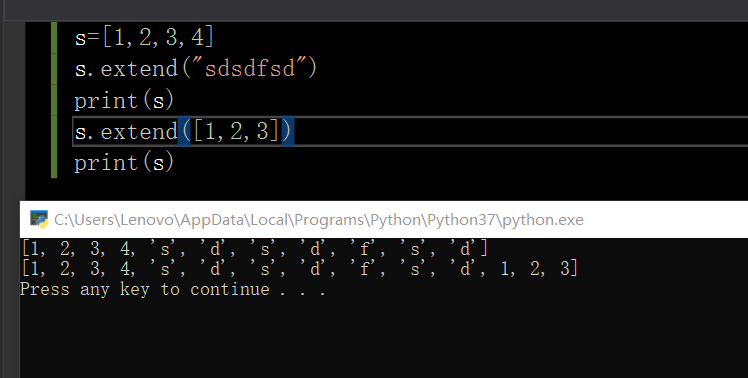 extend函数:将另一个列表的内容与之前的列表拼接起来。将新列表里的元素挨个添加到之前的列表里作为其元素。