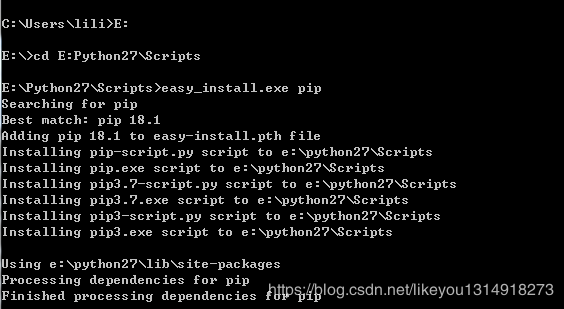 3、注意:要跳到python的安装目录E:\Python27\Scripts一路cd索引到easy_install.exe所在的地方,执行指令“easy_install.exe pip”