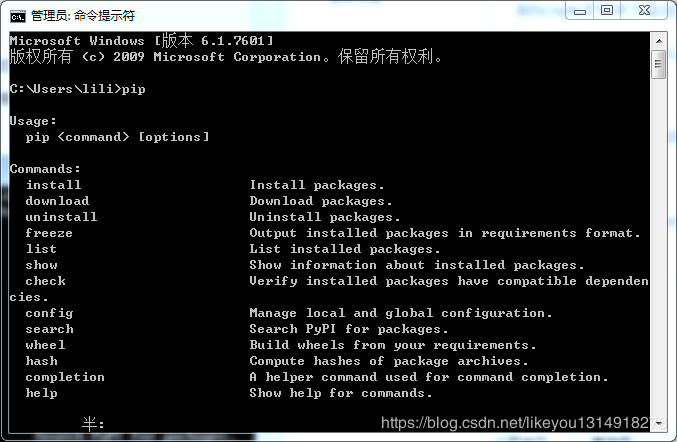 在cmd下输入“pip”,如果能识别"pip"指令,则说明pip安装成功了。