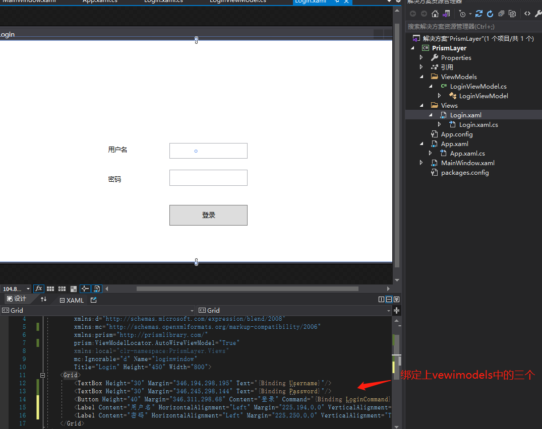 6新建文件夹 Views和ViewModels。 在Views下建立Login.xaml 引入prism框架和定位自动写入model