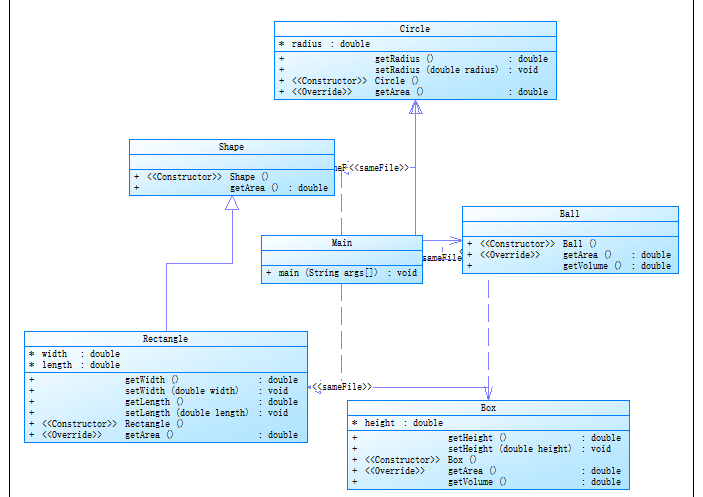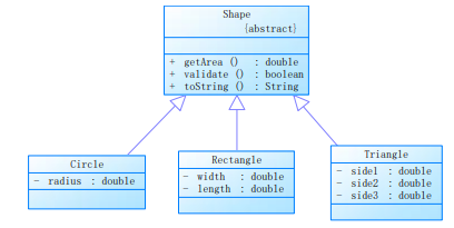 分析:本题的重点是继承,这些图形类共有的方法是求面积getArea,但各图形的具体求面积方法都不同,所以在继承父类时,我们需要重写这个方法即可。其实我们只需要考虑好子类与父类有哪些不同,子类在继承父类时有哪些属性需要增加,哪些方法需要重写,这题就很好解决。