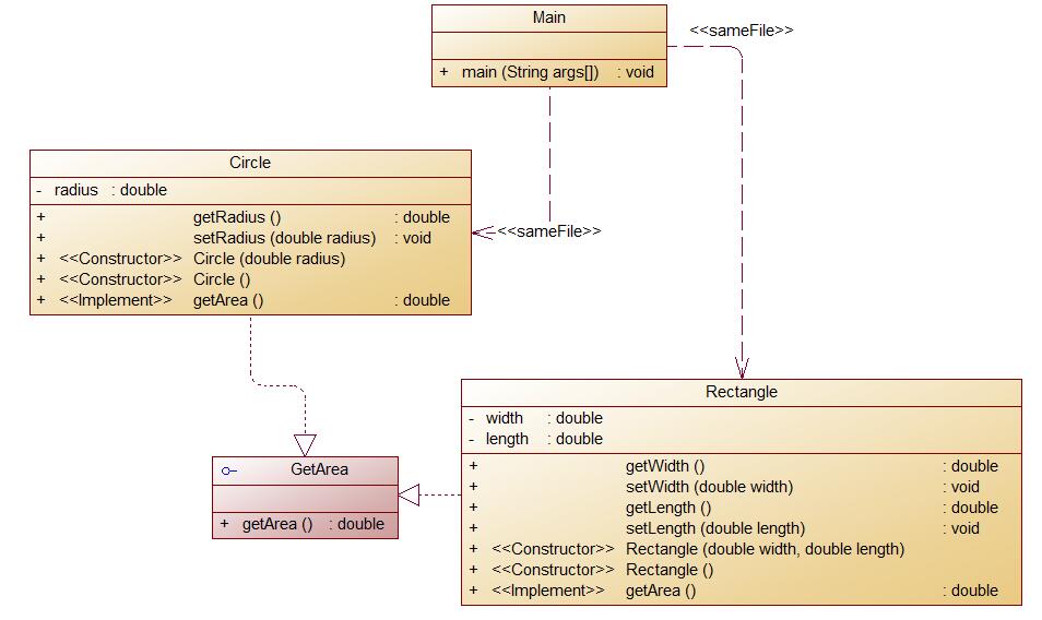 分析:本题考察的是接口及类实现多态性,在代码中使用interface GetArea来实现求面积方法的接口定义,在图形类里使用求面积接口,较为简单