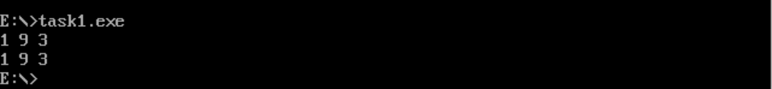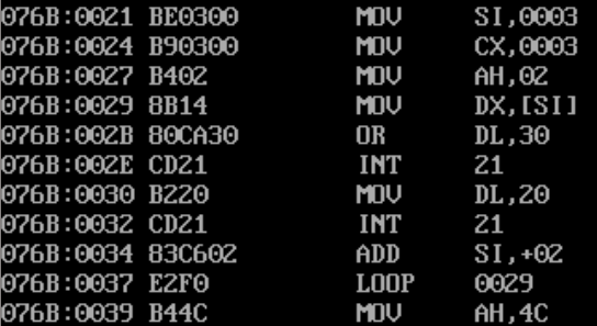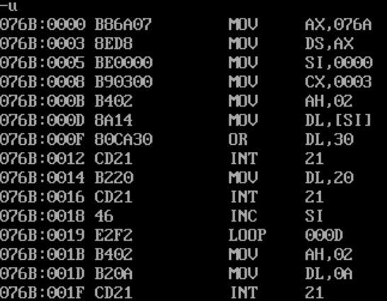 1 assume cs:code, ds:data 2 3 data segment 4 x db 1, 9, 3 5 len1 equ $ - x 6 7 y dw 1, 9, 3 8 len2 equ $ - y 9 data ends 10 11 code segment 12 start: 13 mov ax, data 14 mov ds, ax 15 16 mov si, offset x 17 mov cx, len1 18 mov ah, 2 19 s1:mov dl, [si] 20 or dl, 30h 21 int 21h 22 23 mov dl, ' ' 24 int 21h 25 26 inc si 27 loop s1 28 29 mov ah, 2 30 mov dl, 0ah 31 int 21h 32 33 mov si, offset y 34 mov cx, len2/2 35 mov ah, 2 36 s2:mov dx, [si] 37 or dl, 30h 38 int 21h 39 40 mov dl, ' ' 41 int 21h 42 43 add si, 2 44 loop s2 45 46 mov ah, 4ch 47 int 21h 48 code ends 49 end start