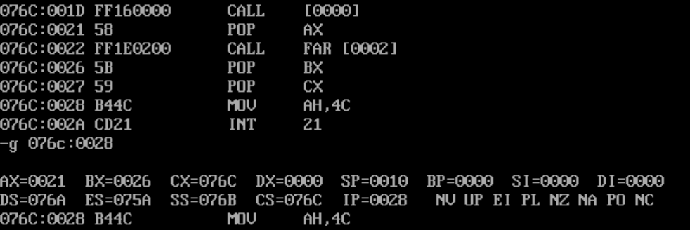 1 assume cs:code, ds:data 2 3 data segment 4 dw 200h, 0h, 230h, 0h 5 data ends 6 7 stack segment 8 db 16 dup(0) 9 stack ends 10 11 code segment 12 start: 13 mov ax, data 14 mov ds, ax 15 16 mov word ptr ds:[0], offset s1 17 mov word ptr ds:[2], offset s2 18 mov ds:[4], cs 19 20 mov ax, stack 21 mov ss, ax 22 mov sp, 16 23 24 call word ptr ds:[0] 25 s1: pop ax 26 27 call dword ptr ds:[2] 28 s2: pop bx 29 pop cx 30 31 mov ah, 4ch 32 int 21h 33 code ends 34 end start
