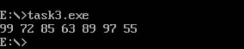 1 assume ds:data, cs:code 2 data segment 3 x db 99, 72, 85, 63, 89, 97, 55 4 len equ $- x 5 data ends 6 7 code segment 8 start: 9 mov ax, data 10 mov ds, ax 11 mov si, offset x 12 mov cx, len 13 mov byte ptr ds:[10], 10 14 15 s1: mov ah, 0 16 mov al, ds:[si] 17 18 div byte ptr ds:[10] 19 call printNumber 20 call printSpace 21 inc si 22 loop s1 23 24 mov ax, 4c00h 25 int 21h 26 27 printNumber:mov bx, ax 28 or bl, 30h 29 or bh, 30h 30 mov ah, 2 31 mov dl, bl 32 int 21h 33 mov dl, bh 34 int 21h 35 ret 36 37 printSpace:mov ah, 2 38 mov dl, ' ' 39 int 21h 40 ret 41 42 code ends 43 end start