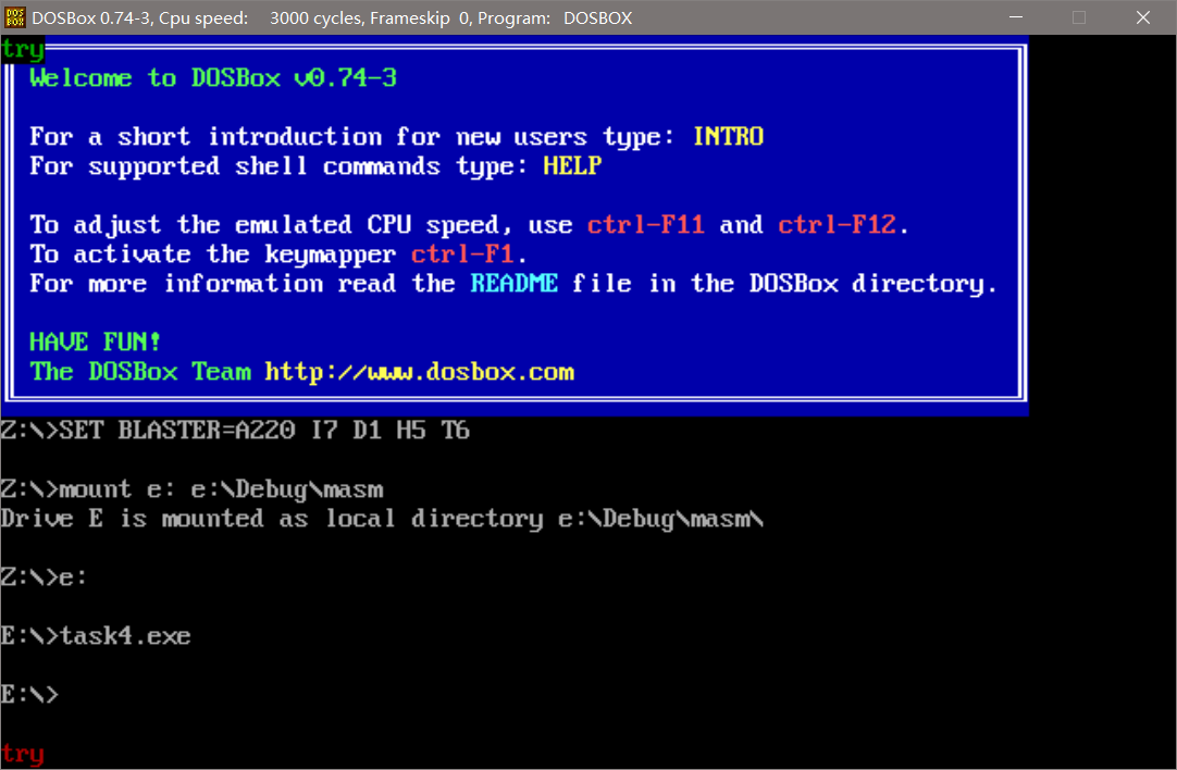 1 assume cs:code, ds:data 2 3 data segment 4 str db 'try' 5 len equ $ - str 6 data ends 7 8 code segment 9 start: 10 mov ax,data 11 mov ds,ax 12 13 mov cx,len 14 mov si,offset str 15 mov bh,0 16 mov bl,2 17 call printStr 18 19 mov cx,len 20 mov si,offset str 21 mov bh,24 22 mov bl,4 23 call printStr 24 25 mov ah,4ch 26 int 21h 27 printStr: 28 mov al,0ah 29 mul bh 30 add ax,0b800h 31 mov es,ax 32 33 mov di,si 34 s: mov al,ds:[si] 35 mov ah,bl 36 mov es:[di],ax 37 inc si 38 add di,2 39 loop s 40 ret 41 code ends 42 end start
