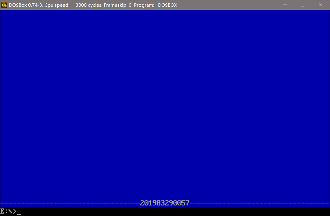 1 assume cs:code, ds:data 2 3 data segment 4 stu_no db '201983290057' 5 len = $ - stu_no 6 data ends 7 8 code segment 9 start: 10 mov ax, data 11 mov ds, ax 12 mov ax,0B800H 13 mov es,ax 14 15 mov cx,0780H; 16 mov ah,10H 17 mov al,' ' 18 mov bx,0 19 s: mov es:[bx],ax 20 add bx,2 21 loop s 22 23 mov cx,80; 24 mov ah,17H 25 mov al,'-' 26 s1: mov es:[bx],ax 27 add bx,2 28 loop s1 29 30 mov cx,len; 31 mov bx,0F44H 32 mov si,0 33 s2: mov al,[si] 34 mov es:[bx],ax 35 inc si 36 add bx,2 37 loop s2 38 39 mov ah, 4ch 40 int 21h 41 42 code ends 43 end start