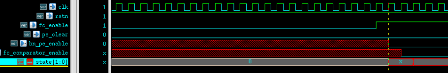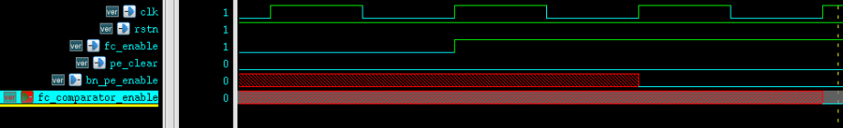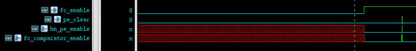 综合以后的网表仿真如下图所示,可以看到,在fc_enable拉高后1个周期bn_pe_enable才从X态变为低电平,而fc_comparator_enable在fc_enable拉高2个周期后才从X态变为低电平
