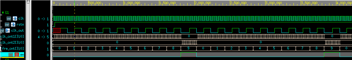 5、en控制分频器输出;en=0时,clk_cnt1累加到N/2 -1,clk_out=1; clk_cnt1累加到N-1,clk_out=0。en=1时,clk_cnt2累加到N /2 ,clk_out=1; clk_cnt1累加到N,clk_out=0