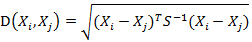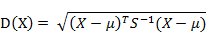 1)马氏距离定义 :有M个样本向量X1~Xm,协方差矩阵记为S,均值记为向量μ,则其中样本向量X到u的马氏距离表示为: