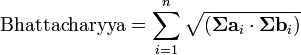 被一个 和 b i的日分区中的样本数量的成员。更多介绍请参看: http://en.wikipedia.org/wiki/Bhattacharyya_coefficient。