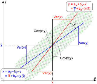 我们发现以上的数据特意选定为完全相关: y = 0.10 + 0.01 x。 于是,皮尔逊相关系数应该等于1。将数据中心化 (通过E(x) = 3.8移动 x 和通过 E(y) = 0.138 移动 y ) 得到 x = (−2.8, −1.8, −0.8, 1.2, 4.2) 和 y = (−0.028, −0.018, −0.008, 0.012, 0.042), 从中