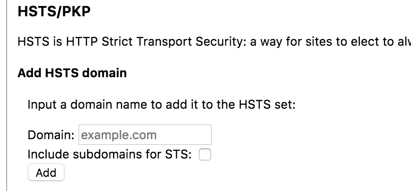 chrome://net-internals/#hsts - 在 Add HSTS domain中添加对应的域名即可。
