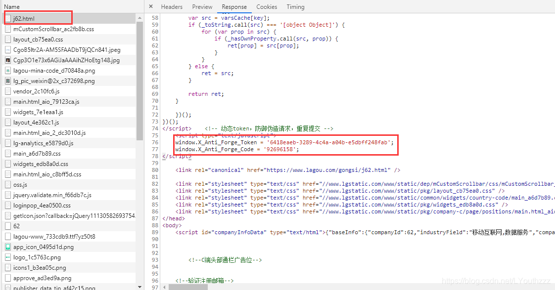 可以发现,cookie以及token参数都是服务器返回的,都藏在了公司主页的请求l中。但是cookie以及token都是动态生成的,当你刷新页面的时候服务器就会返回新的值,而且对IP也是有要求的,请求必须是同一个IP发起的,不然也会被识别为爬虫。