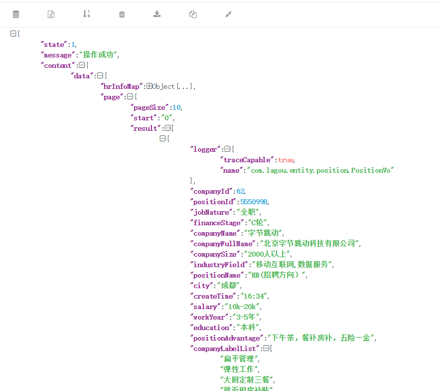 职位信息就藏在了 content.data.page.result 中,就此 拉勾网站的抓取就结束了。