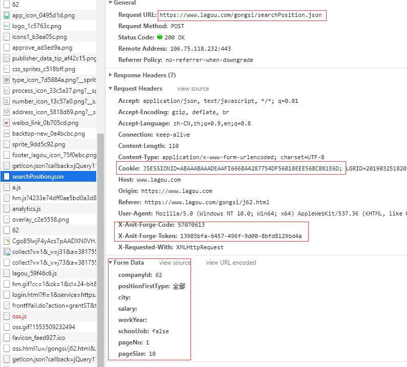 分析接口可以看出,返回数据的接口为 https://www.lagou.com/gongsi/searchPosition.json 请求方式为form post
