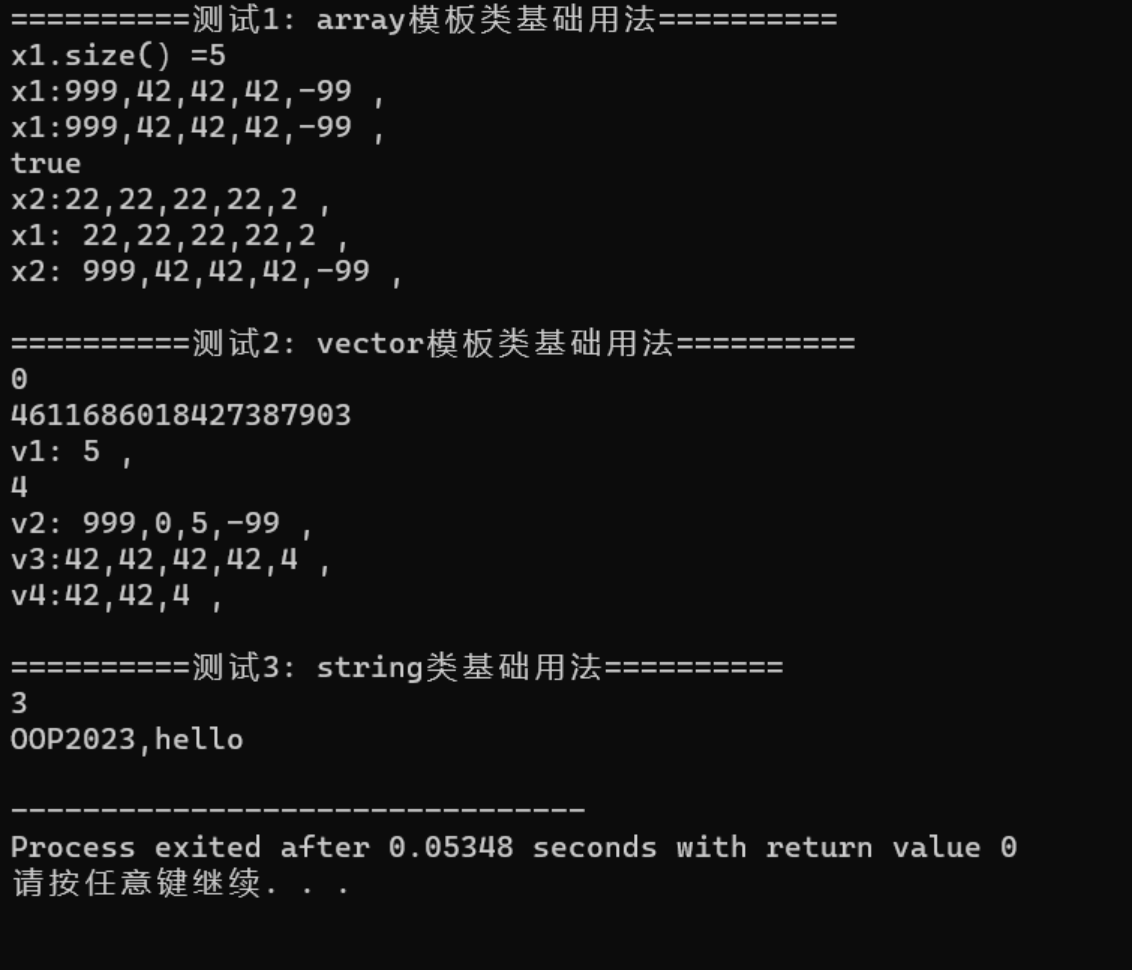 //标准库string,vector,array基础用法 #include<iostream> #include<string> #include<vector> #include<array> //函数模板 //对满足特定条件的序列类型T对象,使用范围for输出 template<typename T> void output1(const T & obj) { for (autoi : obj) std::cout << i << ","; std::cout << "\b\b\n"; } //函数模板 //对满足特定条件的序列类型T对象,使用迭代器输出 template<typename T> void output2(constT& obj) { for (autop = obj.begin(); p != obj.end(); ++p) std::cout << *p << ","; std::cout << "\b\b\n"; } //array模板类基础用法 void test_array() { using namespace std; array<int, 5>x1;//创建一个array对象,包含5个int元素,未初始化 cout << "x1.size()=" << x1.size() << endl;//输出元素个数 x1.fill(42);//把x1的所有元素都用42填充 x1.at(0) = 999;//把下标为0的元素值修改为999 x1[4] = -999;//把下表为4的元素值修改为-999 cout << "x1:"; output1(x1);//调用模板函数output1输出x1 cout << "x1:"; output2(x1);//调用模板函数output1输出x1 array<int, 5>x2{ x1 }; cout << boolalpha << (x1 == x2) << endl; x2.fill(22); cout << "x2:"; output1(x2); swap(x1, x2);//交换array对象x1,x2 cout << "x1:"; output1(x1); cout << "x2:"; output1(x2); } //vector模板类基础用法 voidtest_vector() { usingnamespacestd; vector<int>v1; cout << v1.size() << endl;//输出目前元素个数 cout << v1.max_size() << endl;//输出元素个数之最大可能个数 v1.push_back(55);//在v1末尾插入元素 cout << "v1:"; output1(v1); vector<int>v2{ 1,0,5,2 }; v2.pop_back();//从v2末尾弹出一个元素 v2.erase(v2.begin());//删除v2.begin()位置的数据项 v2.insert(v2.begin(), 999);//在v1.begin()之前的位置插入 v2.insert(v2.end(), -999);//在v1.end()之前的位置插入 cout << v2.size() << endl; cout << "v2:"; output2(v2); vector<int>v3(5, 42);//创建vector对象,包含5个元素,每个元素值都是 42 cout << "v3:"; output1(v3); vector<int> v4(v3.begin(), v3.end() - 2);//创建vector对象,以v3对象的 [v3.begin(), v3.end() - 2)区间作为元素值 cout << "v4:"; output1(v4); } //string类基础用法 voidtest_string() { usingnamespacestd; strings1{ "oop" }; cout << s1.size() << endl; for (auto& i : s1) i -= 32; s1 += "2023"; s1.append(",hello"); cout << s1 << endl; } intmain() { usingnamespacestd; cout << "===========测试1:array模板类基础用法===========" << endl; test_array(); cout << "\n===========测试2:vector模板类基础用法===========" << endl; test_vector(); cout << "\n===========测试3:string类基础用法===========" << endl; test_string(); }