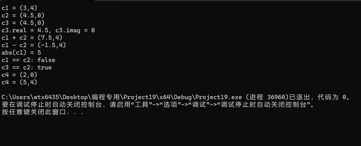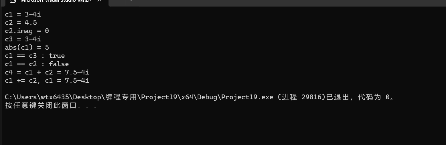 #include <iostream> #include <complex> // 测试标准库提供的复数类模板complex void test_std_complex() { using namespace std; complex<double> c1{ 3, 4 }, c2{ 4.5 }; const complex<double> c3{ c2 }; cout << "c1 = " << c1 << endl; cout << "c2 = " << c2 << endl; cout << "c3 = " << c3 << endl; cout << "c3.real = " << c3.real() << ", " << "c3.imag = " << c3.imag()<< endl; cout << "c1 + c2 = " << c1 + c2 << endl; cout << "c1 - c2 = " << c1 - c2 << endl; cout << "abs(c1) = " << abs(c1) << endl; // abs()是标准库数学函数,对复数取模 cout << boolalpha; // 设置bool型值以true/false方式输出 cout << "c1 == c2: " << (c1 == c2) << endl; cout << "c3 == c2: " << (c3 == c2) << endl; complex<double> c4 = 2; cout << "c4 = " << c4 << endl; c4 += c1; cout << "c4 = " << c4 << endl; } int main() { test_std_complex(); }