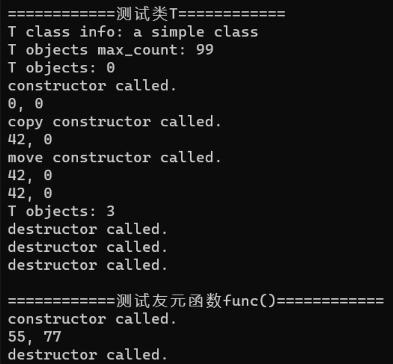 // 一个简单的类T:定义、使用 #include <iostream> #include <string> using namespace std; // 类T的声明 class T { public: T(int x = 0, int y = 0); // 带有默认形值的构造函数 T(const T & t); // 复制构造函数 T(T && t); // 移动构造函数 ~T(); // 析构函数 void set_m1(int x); // 设置T类对象的数据成员m1 int get_m1() const; // 获取T类对象的数据成员m1 int get_m2() const; // 获取T类对象的数据成员m2 void display() const; // 显示T类对象的信息 friend void func(); // 声明func()为T类友元函数 private: int m1, m2; public: static void disply_count(); // 类方法,显示当前T类对象数目 public: static const string doc; // 类属性,用于描述T类 static const int max_count; // 类属性,用于描述T类对象的上限 private: static int count; // 类属性,用于描述当前T类对象数目 }; // 类的static数据成员:类外初始化 const string T::doc{ "a simple class" }; const int T::max_count = 99; int T::count = 0; // 类T的实现 T::T(int x, int y) : m1{ x }, m2{ y } { ++count; cout << "constructor called.\n"; } T::T(const T & t) : m1{ t.m1 }, m2{ t.m2 } { ++count; cout << "copy constructor called.\n"; } T::T(T && t) : m1{ t.m1 }, m2{ t.m2 } { ++count; cout << "move constructor called.\n"; } T::~T() { --count; cout << "destructor called.\n"; } void T::set_m1(int x) { m1 = x; } int T::get_m1() const { return m1; } int T::get_m2() const { return m2; } void T::display() const { cout << m1 << ", " << m2 << endl; } // 类方法 void T::disply_count() { cout << "T objects: " << count << endl; } // 友元函数func():实现 void func() { T t1; t1.set_m1(55); t1.m2 = 77; // 虽然m2是私有成员,依然可以直接访问 t1.display(); } // 测试 void test() { cout << "T class info: " << T::doc << endl; cout << "T objects max_count: " << T::max_count << endl; T::disply_count(); T t1; t1.display(); t1.set_m1(42); T t2{ t1 }; t2.display(); T t3{ std::move(t1) }; t3.display(); t1.display(); T::disply_count(); } // 主函数 int main() { cout << "============测试类T============" << endl; test(); cout << endl; cout << "============测试友元函数func()============" << endl; func(); }