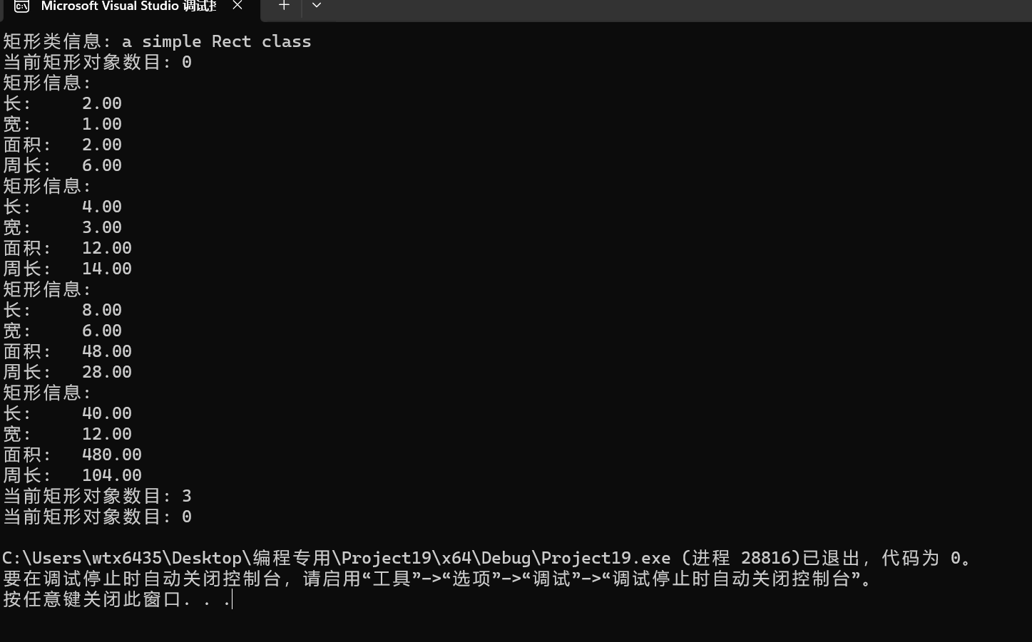 #include <iostream> #include <string> #include <iomanip> using namespace std; class Rect { private: static int size; public: static const string doc; static int size_info() { return size; } friend void test(); private: double length, width; public: Rect(double l = 2.0, double w = 1.0) : length{ l }, width{ w } { size++; } Rect(const Rect& obj) : length{ obj.length }, width{ obj.width } { size++; } ~Rect() { size--; } double len() const { return length; } double wide() const { return width; } double area() const { return length * width; } double circumference() const { return 2 * (length + width); } void resize(double times) { length *= times; width *= times; } void resize(double l_times, double w_times) { length *= l_times; width *= w_times; } }; int Rect::size = 0; const string Rect::doc{ "a simple Rect class" }; void output(const Rect& r) { cout << "矩形信息: " << endl; cout << fixed << setprecision(2); cout << "长: \t" << r.len() << endl; cout << "宽: \t" << r.wide() << endl; cout << "面积: \t" << r.area() << endl; cout << "周长: \t" << r.circumference() << endl; } void test() { cout << "矩形类信息: " << Rect::doc << endl; cout << "当前矩形对象数目: " << Rect::size_info() << endl; Rect r1; output(r1); Rect r2(4, 3); output(r2); Rect r3(r2); r3.resize(2); output(r3); r3.resize(5, 2); output(r3); cout << "当前矩形对象数目: " << Rect::size_info() << endl; } int main() { test(); cout << "当前矩形对象数目: " << Rect::size_info() << endl; }