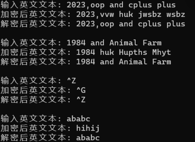 #include "Textcoder.hpp" #include <iostream> #include <string> void test() { using namespace std; string text, encoded_text, decoded_text; cout << "输入英文文本: "; while (getline(cin, text)) { encoded_text = Textcoder(text).get_ciphertext(); // 这里使用的是临时无名对象 cout << "加密后英文文本:\t" << encoded_text << endl; decoded_text = Textcoder(encoded_text).get_deciphertext(); // 这里使用的是临时无名对象 cout << "解密后英文文本:\t" << decoded_text << endl; cout << "\n输入英文文本: "; } } int main() { test(); }