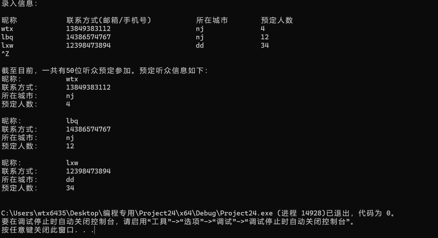 #include <iostream> #include <string> #include <vector> #include"info.hpp" using namespace std; int main(){ const int capacity=100; vector<info> audience_info_list; string nickname, contact, city; int n; vector<info> &i = audience_info_list; int sum=0; cout << "录入信息:\n\n"; cout << "昵称\t\t"; cout << "联系方式(邮箱/手机号)\t\t"; cout << "所在城市\t"; cout << "预定人数" << endl; while(cin>>nickname >> contact >> city >> n){ if(sum+n<=capacity){ info a(nickname,contact,city,n); i.push_back(a); sum +=n; } else{cout << "对不起,只剩" << capacity - sum << "个位置。\n"; cout << "1.输入u,更新(updata)预定信息" << endl; cout << "2.输入q,退出预定" << endl; cout << "你的选择:"; char c; cin >> c; if (c == 'q') break; else if (c == 'u') continue; else break; } if (sum == capacity) break; } cout << endl; cout << "截至目前,一共有" << sum << "位听众预定参加。"; if (sum != 0) { cout << "预定听众信息如下:" << endl; for (int k= 0; k< i.size(); k++) { i[k].print(); cout << endl; } } }
