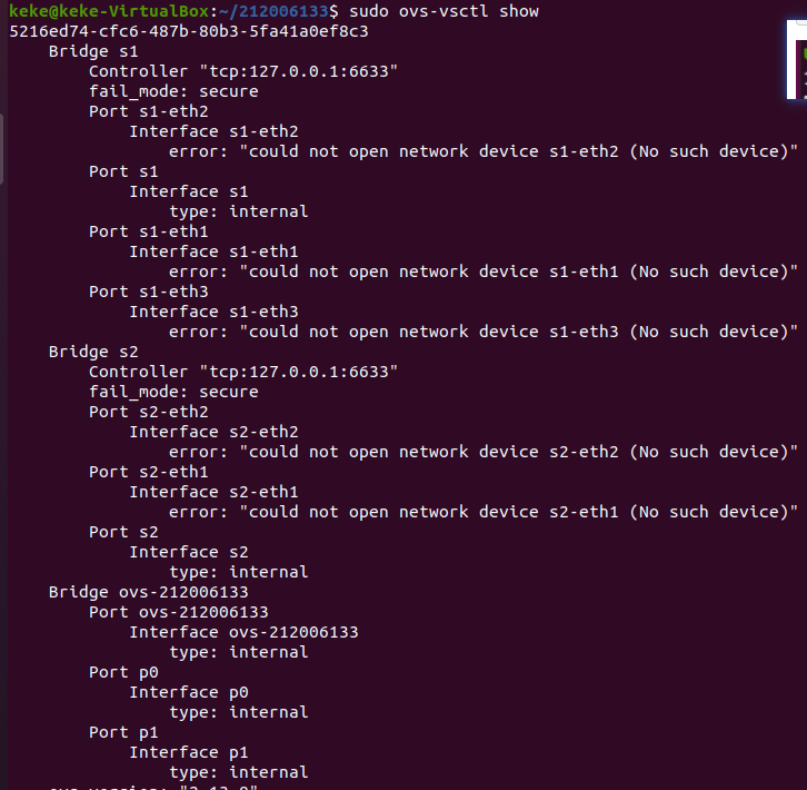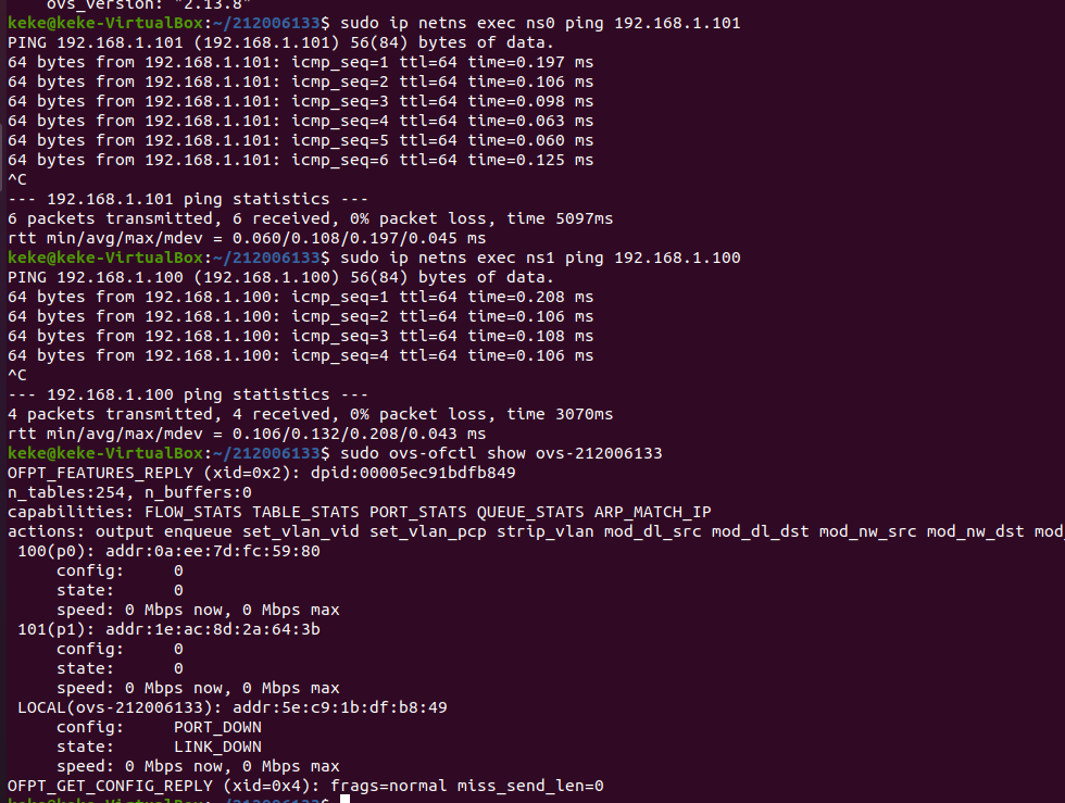 ovs-vsctl基础操作实践:创建OVS交换机,以ovs-xxxxxxxxx命名,其中xxxxxxxxx为本人学号。在创建的交换机上增加端口p0和p1,设置p0的端口号为100,p1的端口号为101,类型均为internal;为了避免网络接口上的地址和本机已有网络地址冲突,需要创建虚拟网络空间(参考命令netns)ns0和ns1,分别将p0和p1移入,并分别配置p0和p1端口的ip地址为190.168.1.100、192.168.1.101,子网掩码为255.255.255.0;最后测试p0和p1的连通性。
