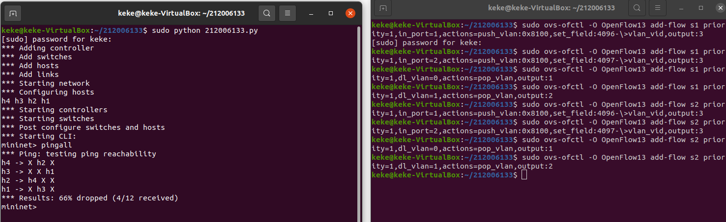 通过命令行终端输入“ovs-ofctl”命令,直接在s1和s2上添加流表,划分出所要求的VLAN。