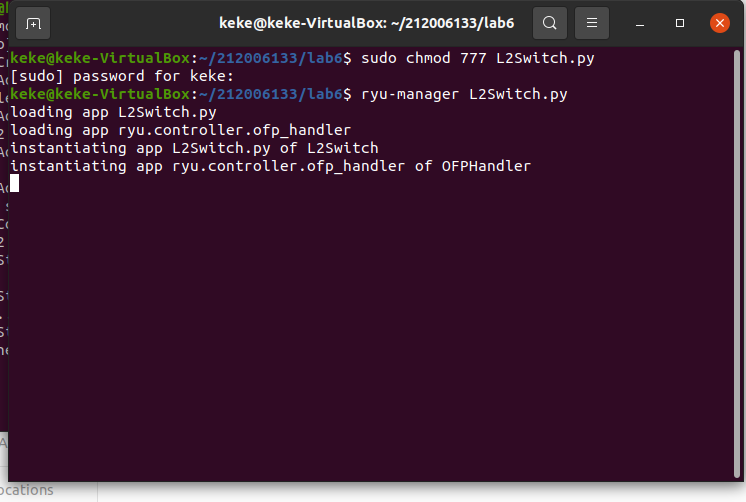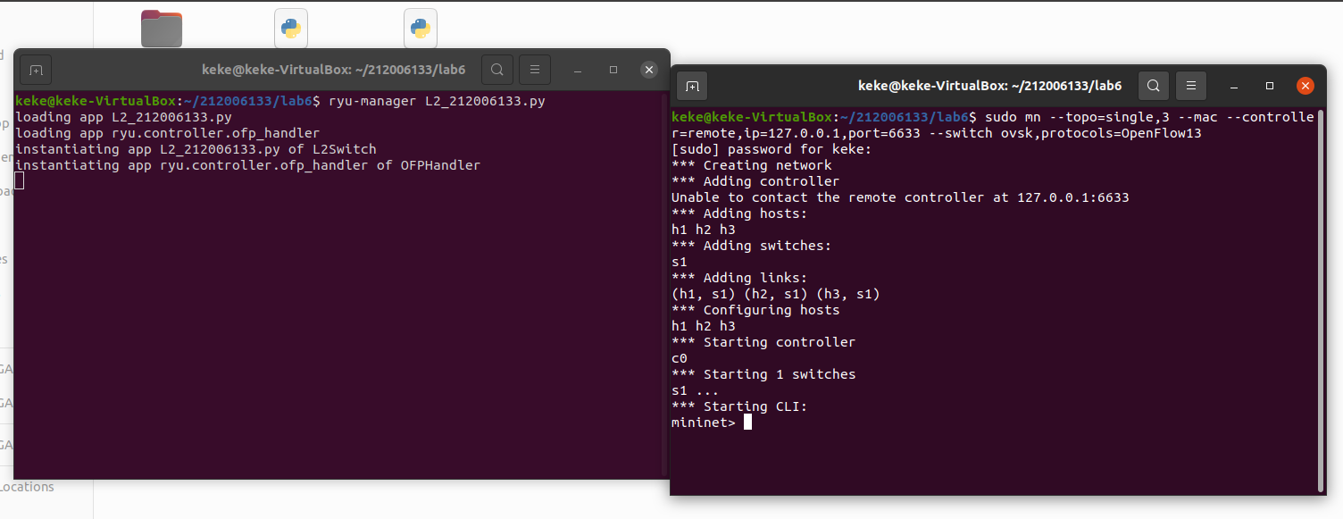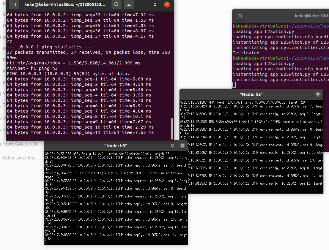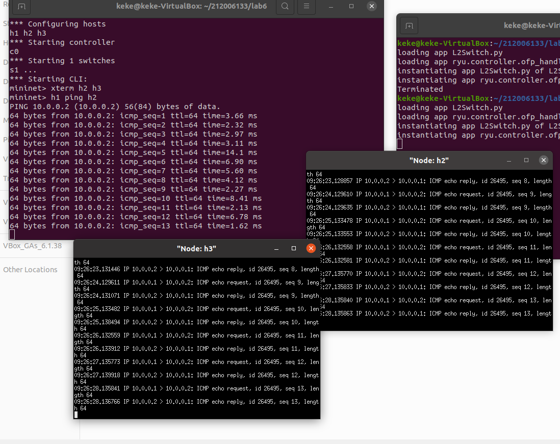 2、阅读Ryu文档的The First Application一节,运行当中的L2Switch,h1 ping h2或h3,在目标主机使用 tcpdump 验证L2Switch,分析L2Switch和POX的Hub模块有何不同。