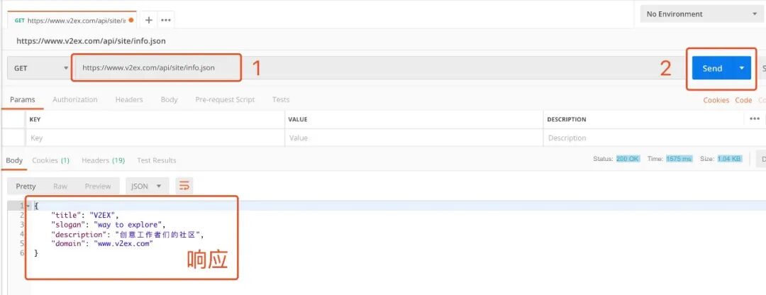 将url复制到图中1处,点击send发送请求,接口的响应就会返回并显示在下方。