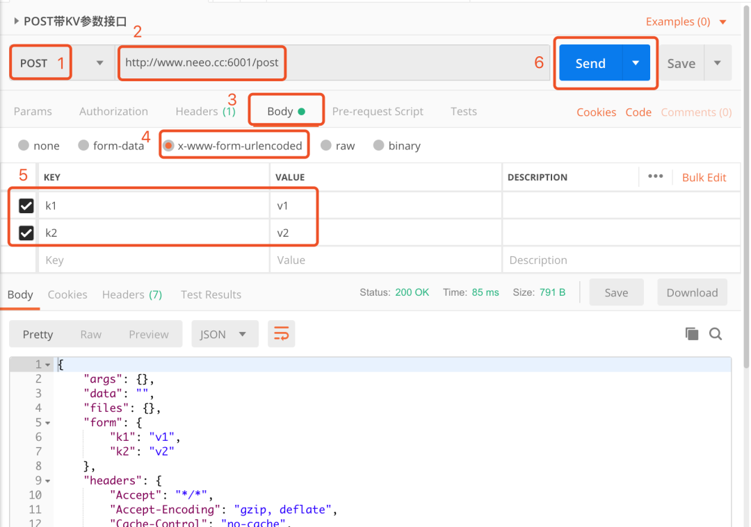 POST类型接口携带的参数如果是key-value类型的,除了之前的基本步骤外,需要在Body中选择x-www-form-urlencoded类型并将参数手动填写到列表中,再点击send按钮发送请求。