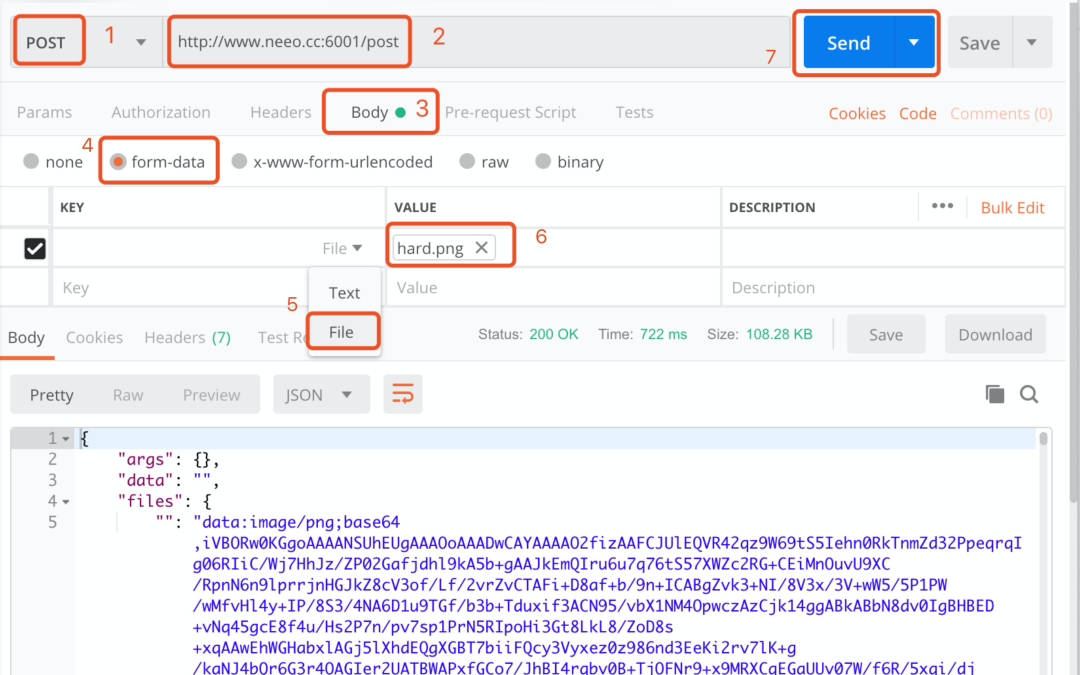 通过form-data类型上传文件的接口其实本质也是一个POST接口。与普通的POST接口不同的是在填写参数时,在key中通过下拉框选择file选项,再点击Select File选择本地的文件进行接口请求。