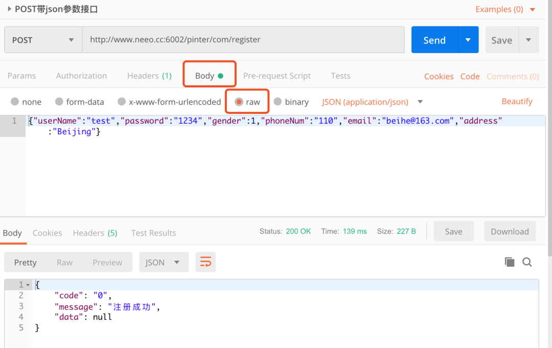 {"userName":"test","password":"1234","gender":1,"phoneNum":"110","email":"beihe@163.com","address":"Beijing"}