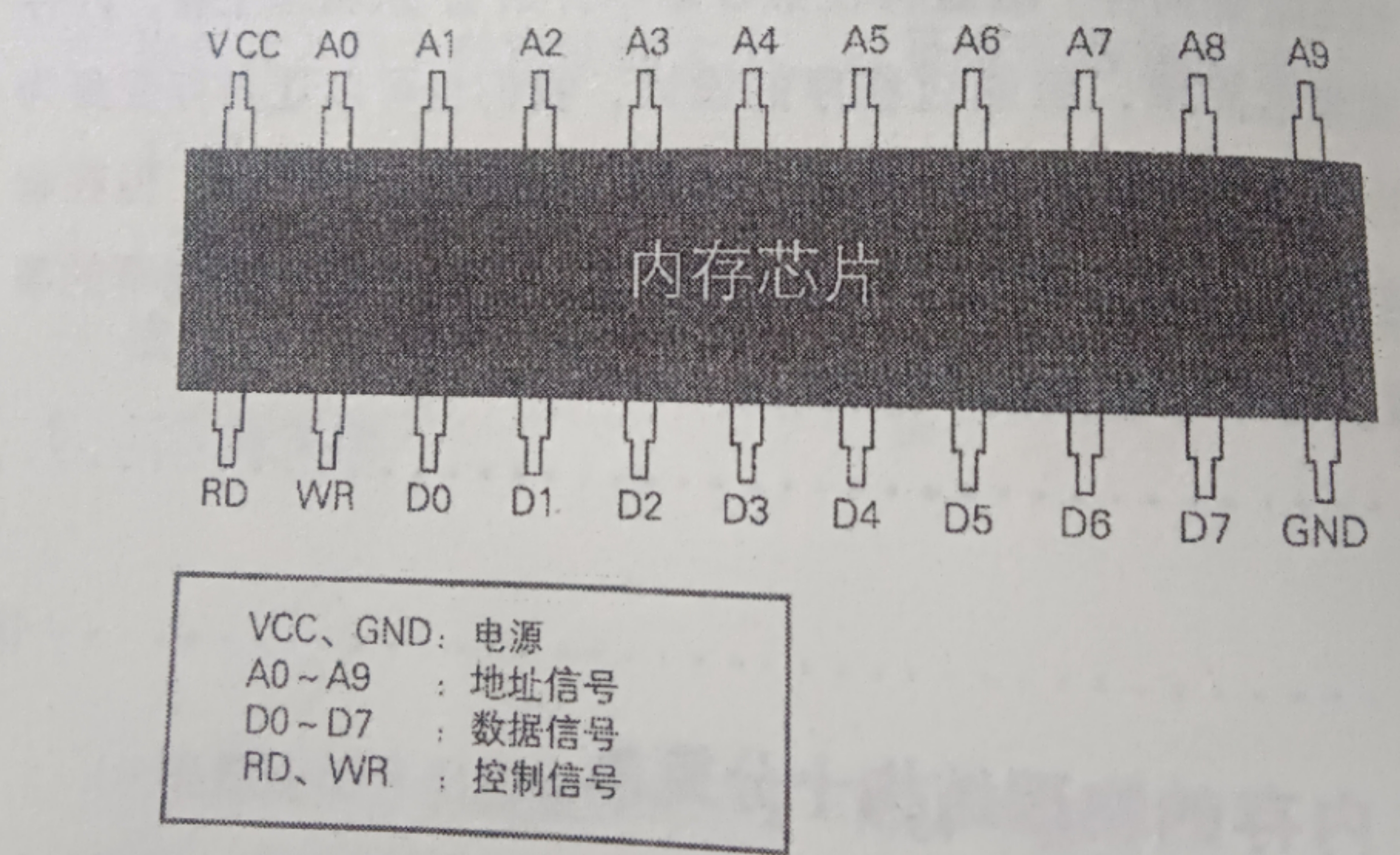 内存本质上是一种名为内存芯片的装置。内存芯片分为RAM、ROM等不同类型。下图是内存芯片引脚配置的一个示例: