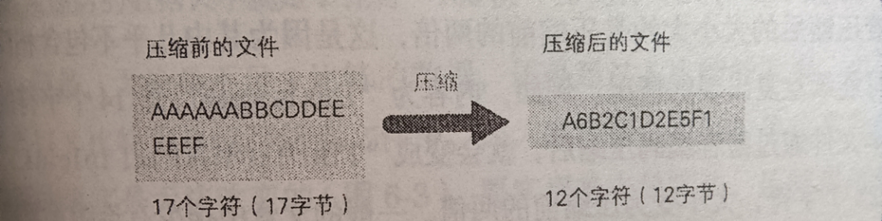 如图所示,像这样将文件内容用“数据×重复次数”来表示的压缩方法称为游程编码。对于相同数据连续重复的情况较多的图片文件,游程编码的效果比较好,但它并不适合用来压缩文本文件。