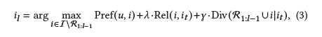 根据user和 iterm的关系 获取其pref, 再根据已选择item和当前备选item的相似 获取其相似性,同时根据当前item和已选择item的相似性 p 可获取其多样性 div=1-p, 并顺序 启发的选择下去,div和rev的lambda 和gama 都是超参