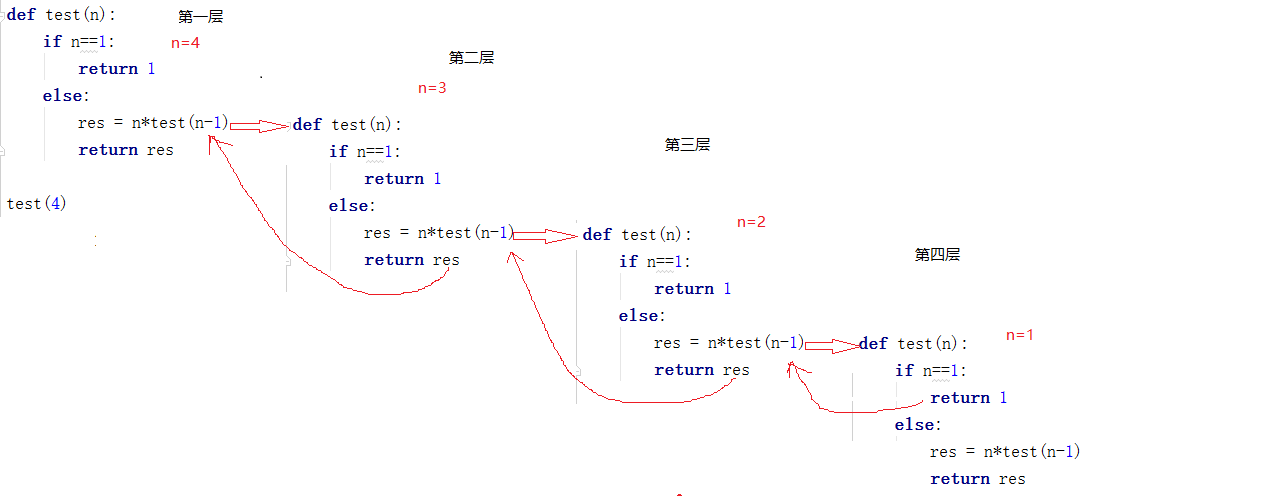 2图中所示test(4)是执行计算4的阶乘,开始执行函数时n=4(函数第一层),代码逐行运行,因为n!=1那么就会执行else代码块中的代码res=n*test(n-1)这时出现了test函数的调用那么就会去执行test函数代码(第一层中的return res 这句代码不会执行),此时传入n的值是3,也就是执行第二层函数,依然同第一层一样n!=1,那么就会执行第二层中else代码块,又会遇到res = n*test(n-1),依然不会执行第二层中的return res。继续执行进入第三层递归,依此类推,直到进入第四层递归 此时的n=1那么就会执行if代码块内的代码return 1此时第四层函数结束,因为第四层递归是从在第三层代码里执行的,那么第四层得到的返回就是第三层的res,此时第三层的res的值已经得到,接下来就会执行return res,又因为第三层递归是在第二层函数代码块里执行的,那么第三层的返回值就是第二层的res......最终返回给第一层的res。最后返回test(4)的结果。