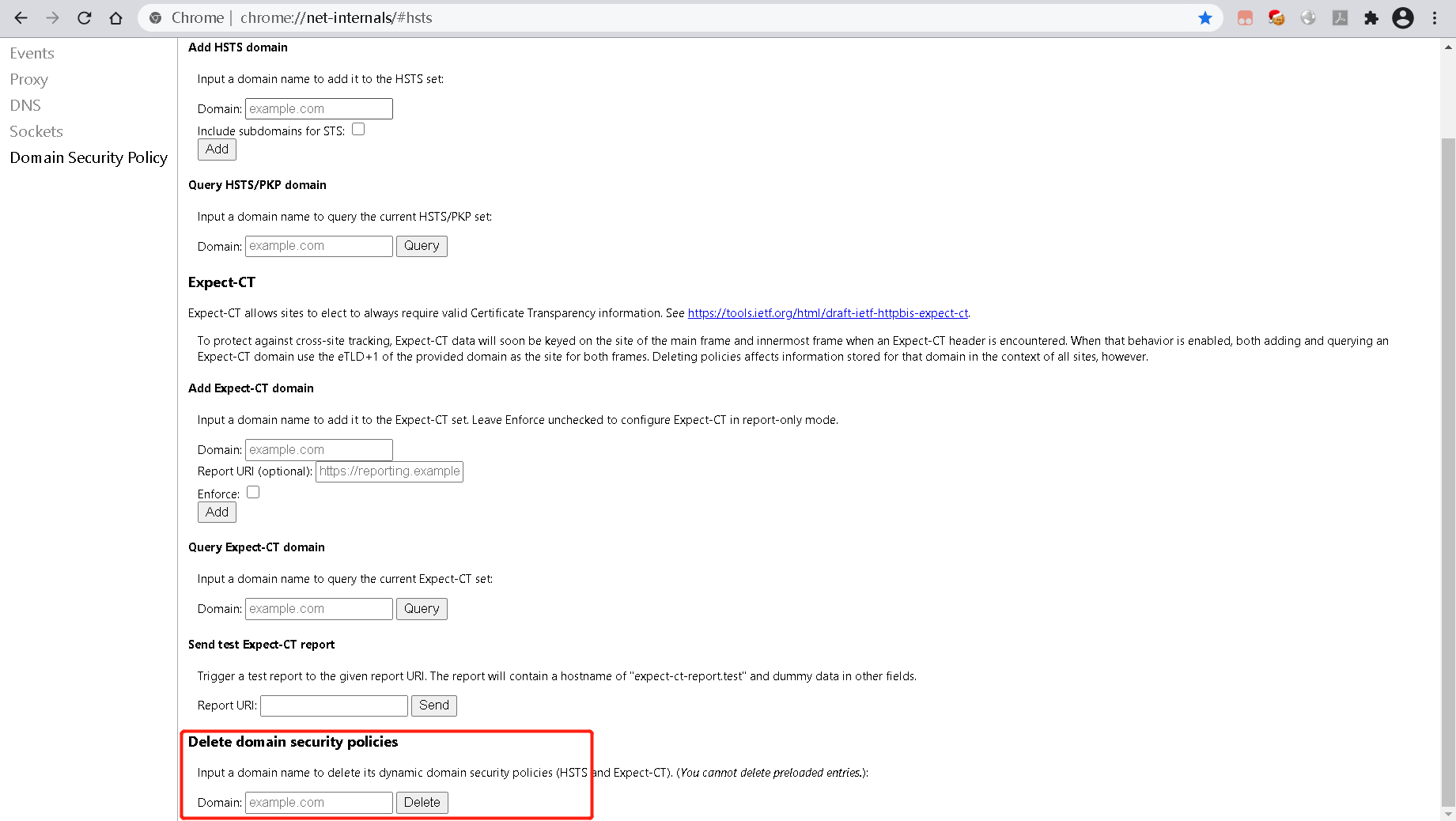 在(谷歌)浏览器输入:chrome://net-internals/#hsts