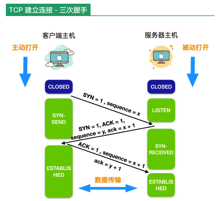 - 客户端在收到服务器发出的响应后,还需要给出确认连接。确认连接中的 ACK 置为 1 ,序号为 seq = x + 1,确认号为 ack = y + 1。TCP 规定,这个报文段可以携带数据也可以不携带数据,如果不携带数据,那么下一个数据报文段的序号仍是 seq = x + 1。这时,客户端进入 ESTABLISHED (已连接) 状态。